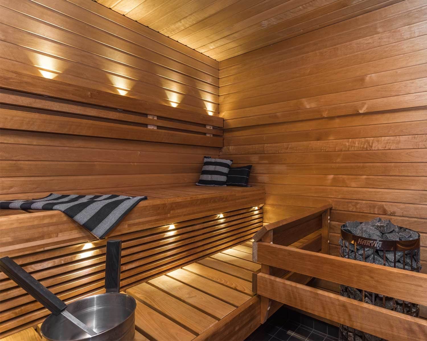 Täydellinen kylpyhuone- ja saunaremontti sähkö- ja putkitöineen tehtiin lokakuussa 2017. Remonttiin sisältyi kaikki katosta lattiaan; lattian valut ja vesieristykset, laatoitukset, saunan panelointi, lauteiden asennus sekä valaistuksen toteutus.