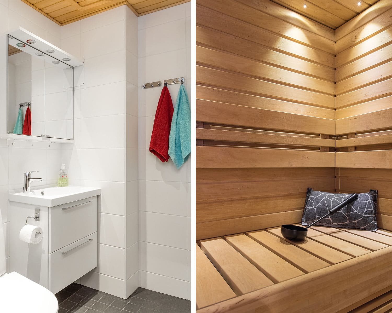 ”Saunan käyttö on moninkertaistunut ja kylppäriä on kaikin puolin kivempi käyttää, kuin valoisuutta tuli lisää. Suihkukaappi, kaapistot ja kaikki pinnat ovat täysin uusia – muuta vanhaa ei jäänyt kuin pesukone”, Järvinen kertoo.